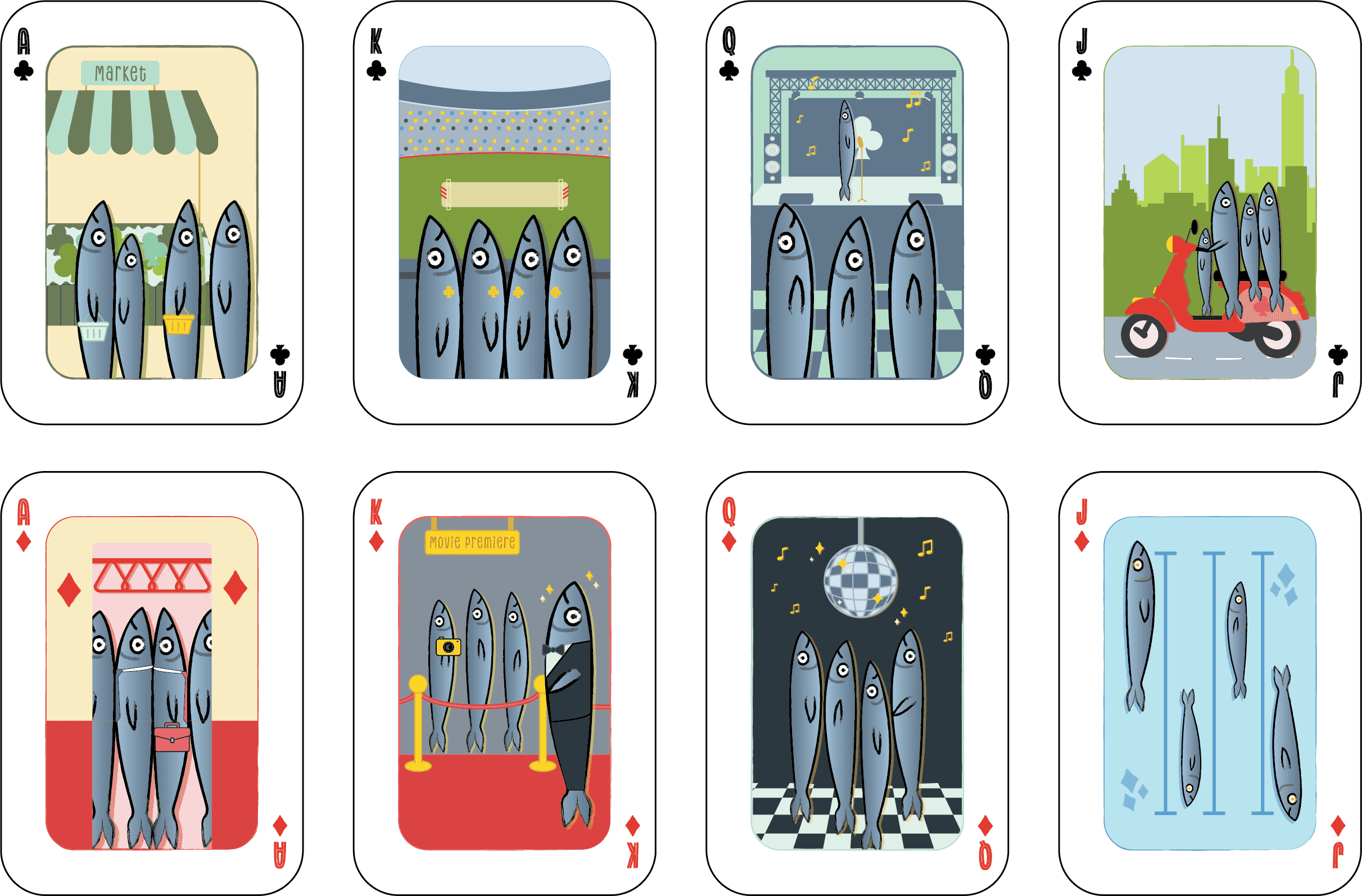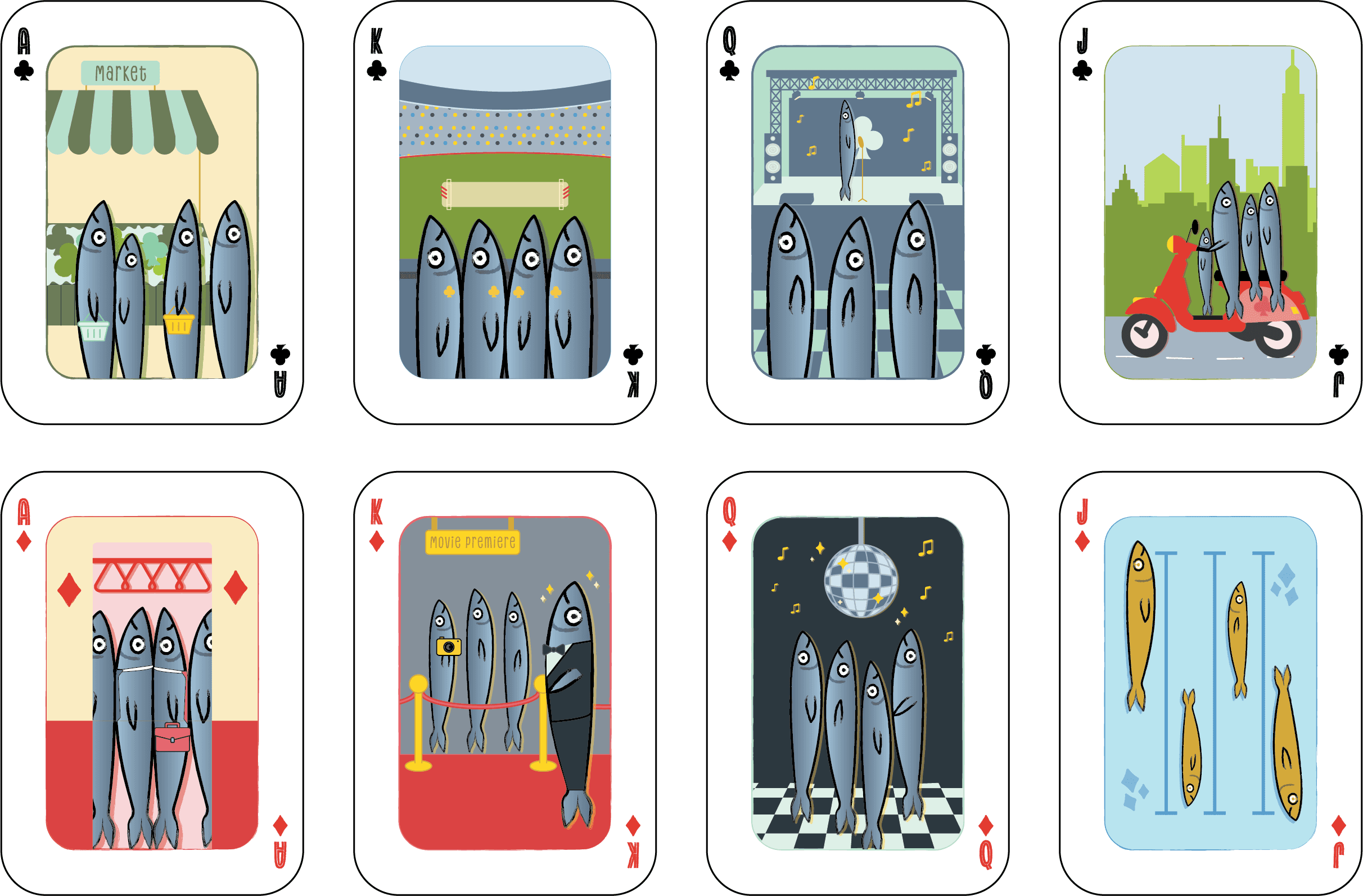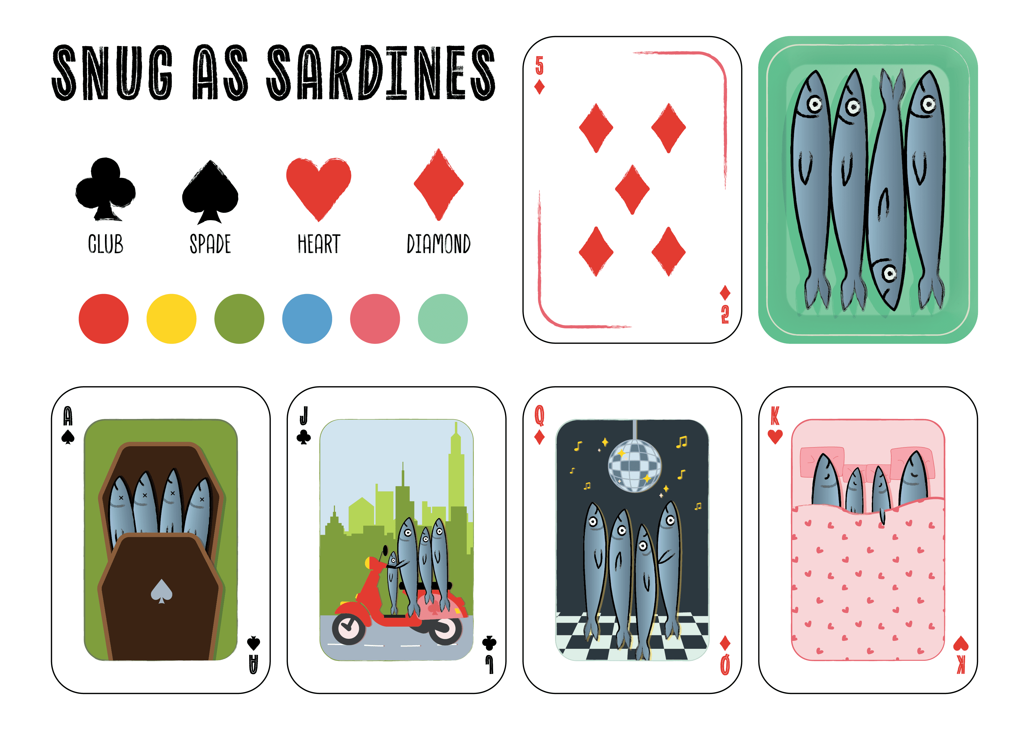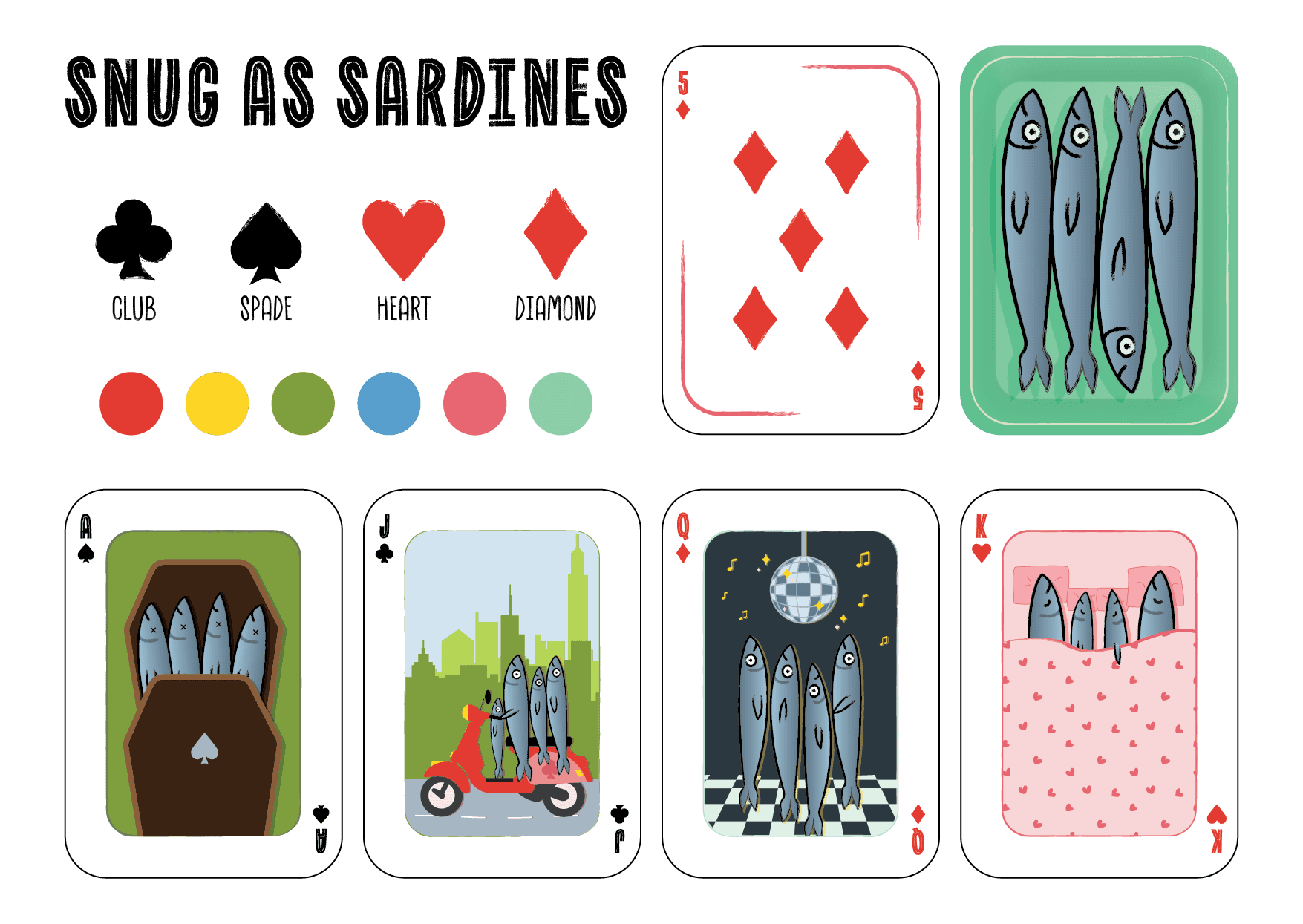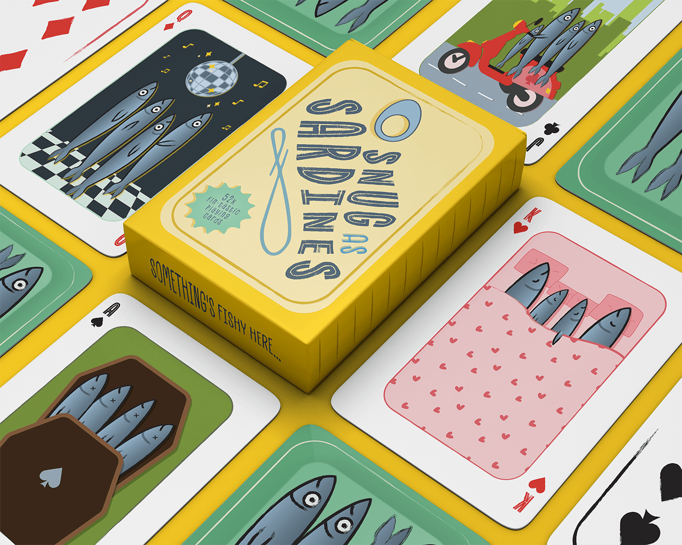 The design system pulls from sardine can art-tight compositions, bold colours, playful typography. The packaging mirrors an actual tin can with a wrapped label aesthetic. The challenge was creating 52 unique cards plus packaging that all felt like one cohesive set while keeping each illustration fresh and specific.