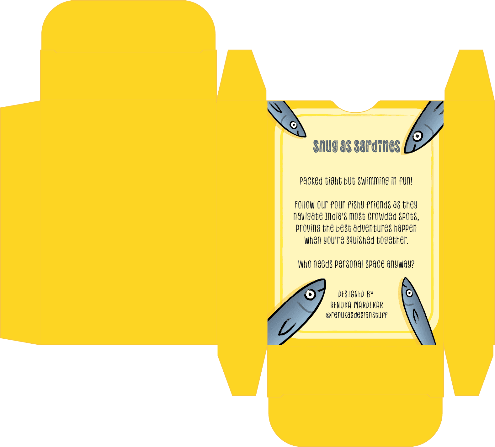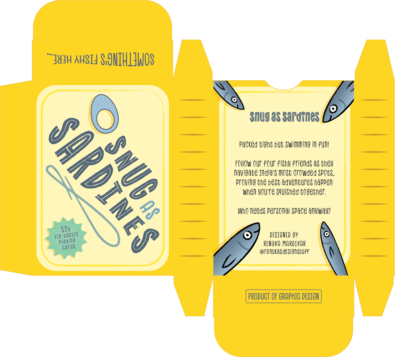 The brief was to design a custom playing card deck based on a design theme or movement. I was drawn to the bold, graphic illustrations on vintage sardine cans, but wanted to create something that felt closer to home. Snug as Sardines reimagines the French deck through everyday Indian experiences of being packed together.